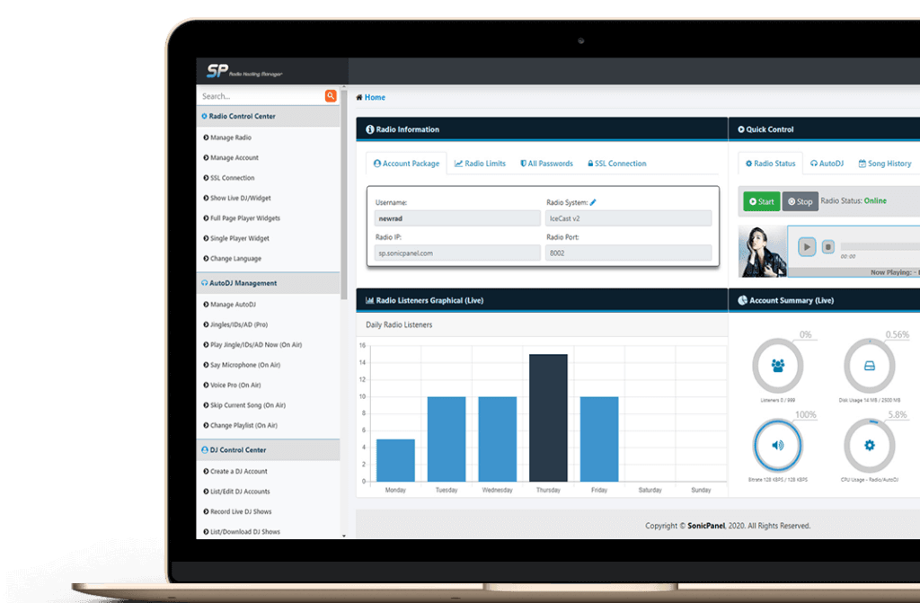Ingresando al panel de control streaming de audio podrá administrar el tipo de servidor y la versión que desea utilizar para la transmisión de su señal radio online, por ejemplo: Shoutcast V1, Shoutcast V2 e Icecast V2, este cambio se puede realizar las veces que estime necesario permitiendo encontrar la mezcla perfecta para su proyecto radial.